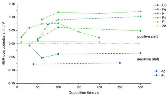 The HER overpotential shifts of considered M@rGO catalysts as a function of electrodeposition time.