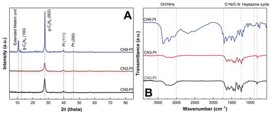 (A) XRD patterns and (B) FTIR spectra of CNx-Pt samples.