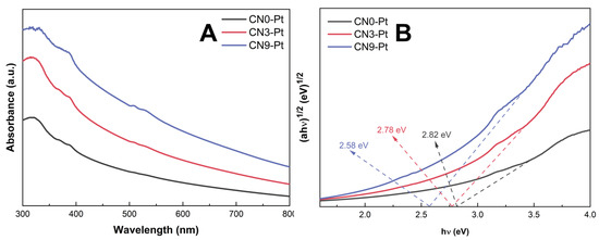 The ultraviolet–visible (UV–Vis) diffuse reflection spectra (DRS) of CNx-Pt were studied, as depicted in Figure 4A. CNx-Pt had a strong absorption peak at 325 nm in the ultraviolet region and a broad tail in the visible-light region. Compared to CN0-Pt and CN3-Pt, CN9-Pt showed a red-shift edge and a higher adsorption shoulder in the visible-light region (325–800 nm), suggesting a substantial light-harvesting capacity improvement and effective photocatalytic activity. The higher adsorption capacity of CN9-Pt could be presumably attributed to the transformation of the lamellar structure to the hexagonal rod-like structure of CN during the long-time hydrothermal treatment [47]. Further, the band gap estimated from the Tauc plot for CN0-Pt, CN3-Pt, and CN9-Pt significantly decreased by 2.82, 2.78, and 2.58 eV, respectively, as shown in Figure 4B.