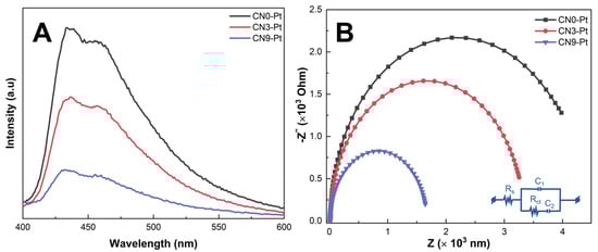EIS was analyzed to further demonstrate the charge separation efficiency of photogenerated carriers. In general, a smaller arc radius in the EIS plot implies a higher charge-transfer efficiency. As illustrated in Figure 5B, the arc radius of the semicircle of the Nyquist diagram of CN9-Pt is smaller than those of CN0-Pt and CN3-Pt, reflecting the high conductivity and effective charge transfer. It is noteworthy that the arc radius of CNx-Pt gradually declined in the order of CN0-Pt > CN3-Pt > CN9-Pt, accompanied by an increase in O-containing functional groups. The parameters (Rs, Rct, C1, and C2) fitted to the Nyquist plots are listed in Table S1 (see Supplementary Materials). This suggests that extending melem units in the rod-like structure after the long-time hydrothermal treatment could facilitate the introduction of O-groups, enhancing charge carrier transfer.