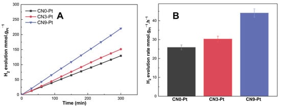The hydrogen evolution performance of CNx-Pt was examined under visible-light illumination to study the role of morphological changes in the improved photocatalytic activity. As shown in Figure 6A, hydrogen production over CN3-Pt (151.4 mmol. gPt−1) was higher than that over CN0-Pt (129.5 mmol. gPt−1). In addition, the H2 evolution over CN9-Pt was the highest, 220.2 mmol. gPt−1, indicating the effect of the rod-like structure on the hydrogen evolution performance. Beyond that, the H2 evolution rate of CNx-Pt increased in the order of CN0-Pt < CN3-Pt < CN9-Pt, as 25.91 < 30.23 < 43.91 (mmol. gPt−1.h−1), as seen in Figure 6B. Wide-range light absorption in the visible-light region, the slow recombination of photogenerated electron holes, and impressively high charge-transfer efficiency can explain the notably increased photocatalytic performance of CN9-Pt. The melem unit extension in CN9-Pt could change the morphology into a rod-like structure, improving the electron transfer. Moreover, the melem unit could obviously introduce more O-containing functional groups via edge defects. Furthermore, the photocatalytic stability of CN9-Pt was investigated in three-run test experiments, as illustrated in Figure S1 (see Supplementary Materials). After a three-run test, H2 production was not decreased, demonstrating excellent photocatalytic stability and reusability for visible-light-driven H2 generation.