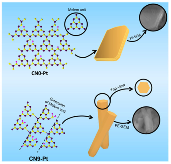 In recent years, the defect engineering and morphological modification of g-C3N4 have been extensively employed to significantly enhance its photocatalytic performance [13,14,15,16]. A simple solvothermal process has been introduced as an effective treatment to modify its morphological properties, including by creating defect sites in g-C3N4, resulting in high photocatalytic activity [17,18,19,20]. However, even though the solvothermal treatment is a facile and green method for generating desirable defect sites and oxygen functional groups on the g-C3N4 surface, the morphological modification of the g-C3N4 structure, including the extension of melem units, has also been observed under harsh treatment conditions [21,22]. To the best of our knowledge, there have been no reports on the effects of extended melem unit formation on g-C3N4 via hydrothermal treatment, Pt properties, or the hydrogen evolution performance of g-C3N4-Pt photocatalysts.