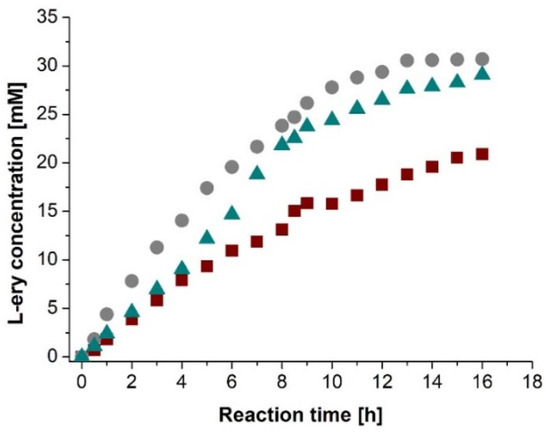 L-erythrulose (L-ery) synthesis by different combinations of immobilized enzymes: each enzyme separately [DAAO][CAT][TK] (■), [DAAO+CAT] together and [TK] separately (⬤) and the three enzymes together [DAAO+CAT+TK] (▲). Conditions: D-serine (50 mM), GOA (50 mM), ThDP (0.1 mM), MgCl2 (1 mM), pH 7.0, 30 °C, 400 rpm, in the presence of O2. pH was regulated by pH-stat for 16 h. The quantities of each enzyme are indicated in Table 1 (1 g of biocatalyst).