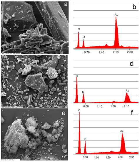 Morphological analysis (250×) and EDS. (a,b) Correspond to the BHET, (c,d) correspond to BHETc, and (e,f) correspond to the biocatalyst C/BHET. The signal of Au belongs to the coating of the samples performed for analysis purposes.