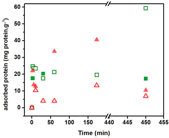It is worth noticing that, in the particular case of the BHET support, the supernatant in contact with this material during the adsorption process shows a certain turbidity attributed to species coming out of the support material. This observation made it difficult to follow the amount of protein adsorbed over time as performed with the other supports. Nevertheless, the protein loading was calculated as the amount of protein per weight of the biocatalyst (instead of support).