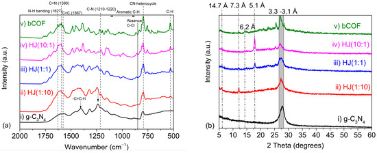 The structure, morphology, and chemical composition of the g-C3N4 material and the bCOF have been previously described in references of Papailias et al. [25] and Bika et al. [32]. The FTIR spectra of the pristine and heterojunction materials with the three different ratios are presented in the order of (i) g-C3N4, (ii) HJ(1:10), (iii) HJ(1:1), (iv) HJ(10:1), and (v) bCOF, in Figure 1a (range: 500–2000 cm−1) and Figure S2 (range: 400–4000 cm−1). The substitution of the chlorine ions of cyanuric chloride by the highly exfoliated sheets of g-C3N4 and then by the 4,4′-bipyridine is validated by the absence of the C-Cl stretching vibration bond at 850 cm−1 for the HJ spectra (Figure 1a). The creation of –N-C-H between g-C3N4 and cyanuric chloride is further confirmed by the peak appearance at 2769 cm−1 of the HJ materials (Figure S2). Since the g-C3N4 and the bCOF are composed by similar carbon and nitrogen bonds, any further distinction in the HJ materials is challenging. The breathing mode of the triazine units is located at the range of 805–810 cm−1 depending on the triazine and heptazine configuration and the characteristic stretching of C-N, C=N heterocycles correspond to 1232–1629 cm−1, observable in all HJ spectra (Figure S2). As the percentage of the COF increased though, these peaks in the HJ spectra became more distinct and intense. All vibrations are present in the HJ materials at the lower and higher frequencies. Additional =C-H bending and C-H stretching vibrations are traced at 530, 990, 3047 cm−1, originating from the 4,4′-bipyridine units of bCOF and at 1408 cm−1 from g-C3N4. The shift of the C-N stretching at 1240 cm−1 and the decrease of its intensity at is indicating a reaction between the terminal –N-H of g-C3N4 and the carbon atoms of the C3N3Cl3 ring.