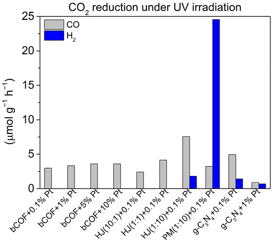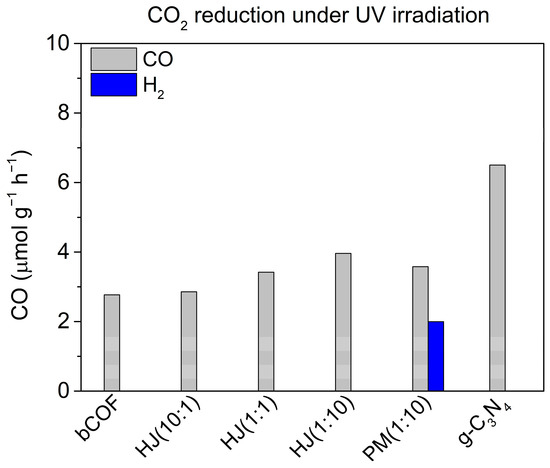 The HJ(1:10) photocatalyst with the best performance among the new heterojunction materials was compared to the physical simple mixing PM(1:10) of the two oppositely charged organic semiconductors, g-C3N4, and bCOF, with the ratio of (1:10) in H2O. Its activity is displayed in Figure 4, along with the PM(1:10) that demonstrated inferior catalytic performance of 3.58 μmol g−1 h−1 CO with the simultaneous competing evolution of 1.99 μmol g−1 h−1 H2, indicating that the intermolecular electron transfer is less efficient than the intramolecular interaction [16,36,40] between g-C3N4 and COF in the heterojunction material for the CO2 photoreduction to CO. Although the PM(1:10) is less effective and selective than HJ(1:10), it offers a slightly better CO yield than bCOF, outlining the synergetic effect of COF and g-C3N4. On the other side, g-C3N4 loses its strong ability to reduce CO2 in the presence of the bCOF in the PM(1:10).