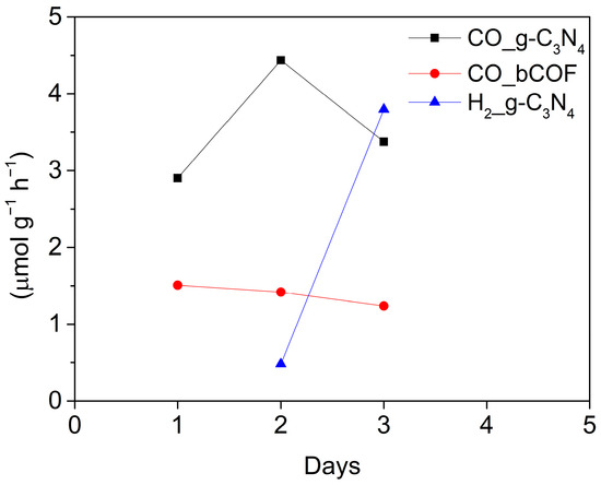 To assess a catalyst, the catalytic durability is important to evaluate. Each photocatalytic cycle follows the same procedure as CO2 reduction described in Section 3.5. The dispersion undergoes purging of 20 min with Ar flow, before loading the reactor with CO2 gas and letting the photocatalytic reaction proceed for 24 h. The outlet gas is analyzed by the GC at the end of each cycle and then the process is re-initialized with Ar flow to exclude the impact of the products produced in the previous cycle. The sustainability experiments of the pristine materials during 3 days of UV irradiation are shown in Figure 6 and demonstrated that both bCOF and g-C3N4 have lower CO rates from the 1st day. A possible explanation is that the organic networks had physisorbed on the surface molecules beneficial to CO2 reduction that were desorbed with Ar bubbling. The g-C3N4 rate of CO kept changing during the repeated cycles, while H2 was being produced due to the occurrence of the competing proton reduction reactions. On the other side, the bCOF offered a constant rate with 100% selectivity towards CO.