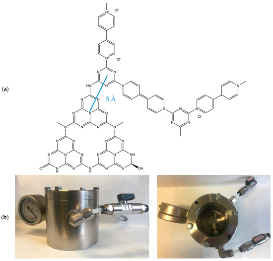 (a) One of the proposed repetitive units of the heterojunction materials and the bond created between the nitrogen of g-C3N4 and the triazine of cyanuric chloride. The distance between the center of the closest heptazine in g-C3N4 and the center of the closest triazine in COF is calculated by the ChemDraw Software 16.0 at 5 Å. The g-C3N4 after its exfoliation contains -OH and =O groups. In the COF component, the three redox states (oxidative, radical, and reduced) of 4,4′-bipyridine are denoted. (b) The custom-made cylindrical stainless steel batch reactor used for the photocatalytic process.