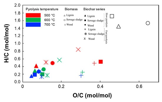 The balance between graphitization and residual groups is a matter of complexity, and it is related to the selection of BC productive conditions. These are strictly connected to the BC final use, and their choice is used to tailor key parameters ranging from grindability to physicochemical properties (i.e., residual functional groups, conductivity, and degree of carbonization) [62]. Among all parameters, the processing temperature plays a major role, and its effect can be monitored through the Van Krevelen graph (see Figure 1) plotting the molar ratios H/C versus O/C.