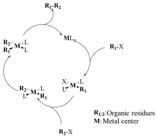 The cross-coupling reactions are powerful tools for any synthetic process that requires the formation of new carbon–carbon or carbon–heteroatom bonds [163]. These reactions are possible only in the presence of specific catalytic metal centers [164] that promote mechanisms such as the one schematized in Figure 3.