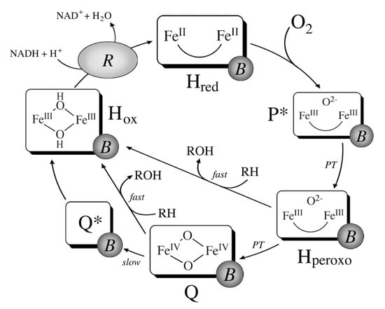 Schematic depiction of the sMMO catalytic cycle. R represents the MMOR reductase component, while B is the regulatory MMOB component (reprinted with permission from Ref. [80]. Copyright 2015, American Chemical Society).