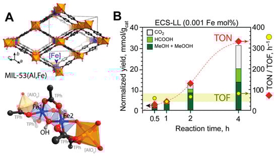 (A) Depiction of the MIL-53(Al,Fe) crystal structure, along with a representation of an isolated Fe-Fe site within the MOF octahedral [AlO] chain. (B) Evolution of the oxidation products and the associated turnover frequency (TOF) and turnover number (TON) values during the MTM conversion in the presence of low concentrations of the ECS-LL catalyst (adapted with permission from Ref. [86]. Copyright 2018, American Chemical Society).