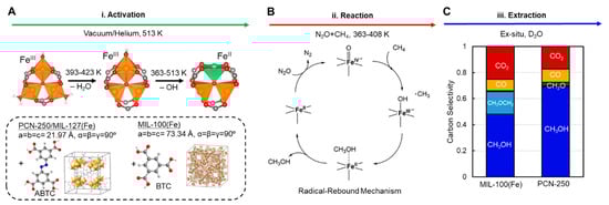 (A) Molecular structure of the Fe--oxo secondary building unit and its ligand modifications upon thermal activation. The unit cells of PCN-250 and MIL-100(Fe) are displayed in the inset, along with the corresponding ABTC and BTC linkers. (B) Schematic representation of the commonly proposed radical-rebound mechanism followed by methane activation on mononuclear Fe(II) centers exposed to mixtures of NO + CH. (C) Cumulative carbon selectivity of products observed upon exposure of MIL-100(Fe)/PCN-250 to 80 kPa of NO, 10 kPa of CH, and 10 kPa of Ar at 120 °C for 4 h. The product selectivity is reported in ascending order: CHOH (dark blue), CHOCH (light blue), CHO (green), CO (yellow), and CO (red) (reprinted with permission from Ref. [66]. Copyright 2021, American Chemical Society).