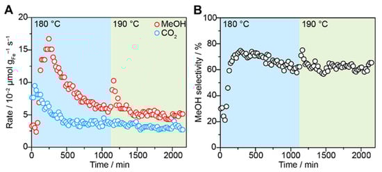 Finally, a very recent study by Rungtaweevoranit and coworkers [91] reported a MOF with isolated Fe sites supported on the Zr-based UiO-66 structure, which may perform the MTM reaction under continuous gas-phase flow conditions in the presence of O and water vapor. In the synthesized UiO-66 material there is approximately 1 acetate molecule and one HO/HO pair per Zr oxide cluster replacing the linker in missing-linker defects, which were leveraged to anchor Fe atoms onto the MOF. The activation of the Fe/UiO-66 catalyst was conducted by heating up to 250 °C under Ar and exposing the MOF to (i) 10% O/Ar at 250 °C for 1 h, (ii) 5% water vapor in Ar for 1 h at 250 °C, 1 bar, and (iii) Ar, while decreasing the temperature to a final value of 180 °C. The Fe/UiO-66 MOF was then exposed to the reaction gas mixture (10% CH, 5% O + 0.2% HO, balance Ar) at 5 bar. During the first 250 min of the reaction, the rate of methanol formation increased up to 16.7 × 10 mol g s (Figure 6A). Subsequently, the MOF catalyst entered a deactivation phase over 850 min, while increasing the reaction temperature to 190 °C resulted in a short increase of catalytic activity up to 10.3 × mol g s (see Figure 6A). Conversely, CO formation reached a rate of 9.5 mol g s over 650 min and was not affected by the temperature increase to 190 °C. Under the steady-state conditions at 180 °C (Figure 6B), the Fe/UiO-66 catalytic platform exhibited a selectivity towards the formation of methanol of 62%.