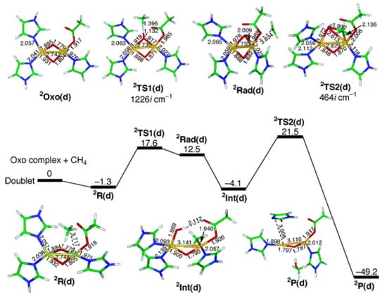 Nonetheless, numerous reaction schemes have been proposed to explain the reactivity of pMMO during the MTM process. A DFT-based study by Yoshizawa and coworkers modeled the reaction pathway over a dicopper site (see Figure 8), assuming a radical rebound mechanism [99]. Following O activation, a superoxo-bridged doublet dicopper active species (Oxo) is formed. This species interacts with methane leading to intermediate R, which subsequently undergoes an H-bond cleavage process through a transition state TS (18.9 kcal/mol) to form the methyl radical (Int). Then, a radical rebound step (TS2, 25.9 kcal/mol) finally yields CHOH and a monoxygenated dicopper site P while releasing 45.1 kcal/mol.