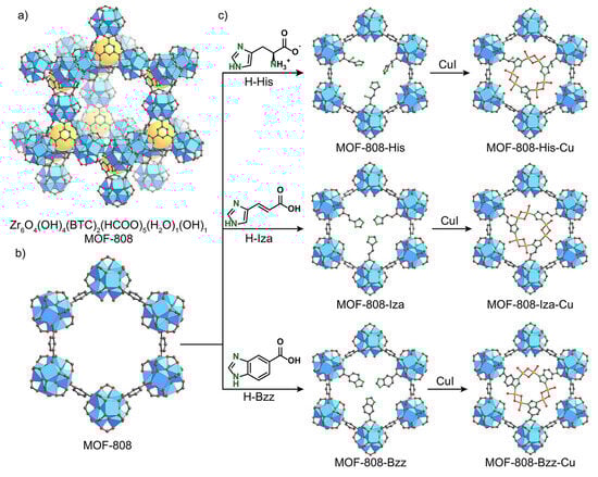 Synthesis of bioinspired MOF-808-supported Cu catalysts. (a) MOF-808 structure. (b) Pseudohexagonal pore opening of MOF-808. (c) Replacement of formate groups with imidazole-containing ligands and subsequent metalation with Cu(I) (adapted with permission from Ref. [69]. Copyright 2018, American Chemical Society).