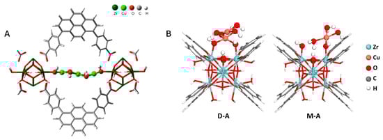 Proposed DFT structures of the Cu-NU-1000 active sites, synthesized either by atomic layer deposition (A) or by metal exchange strategies (B). ((A) Reprinted with permission from Ref. [71]. Copyright 2017, American Chemical Society). ((B) Reprinted with permission from Ref. [70]. Copyright 2019, American Chemical Society).