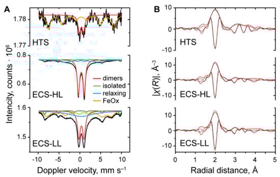 (A) Mössbauer spectra of the HTS, ECS-HL, and ECS-LL catalysts in zero field at −231.15 °C (the experimental data are represented by black solid lines, and the corresponding fitted components are represented by colored lines). (B) Fourier transform of EXAFS Fe K-edge experimental (red) and fitted (black) data for the HTS-1, ECS-HL, and ECS-LL samples (adapted with permission from Ref. [86]. Copyright 2018, American Chemical Society).