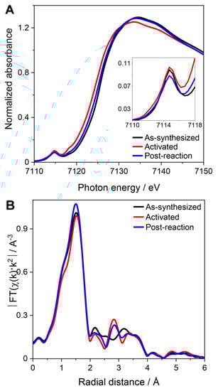 Simons and coworkers [66] employed in situ XAS to track the structural and electronic variations of the Fe sites in PCN-250 both after thermal activation and after the NO + CH reaction. Figure 13A compares the XANES of the as-synthesized (black), thermally activated (red), and post-reaction (blue) materials. Overall, thermally activating the MOF in He to 240 °C produced a shift of the XANES absorption edge energy to lower energies as well as a decrease in the white line intensity. In addition, a decrease in the Fourier transform (FT) magnitude of the EXAFS spectrum at 2.03 Å was observed during activation (see Figure 13B), in agreement with the temperature-induced removal of HO and HO species directly coordinating the iron MOF centers. After performing the MTM reaction at 120 °C, the XANES absorption edge shifted once again to higher energies while the magnitude of the FT at 2.04 Å increased, indicating that Fe(II) sites had been converted back to Fe(III) and likely coordinated by additional ligands. Fitting of the EXAFS data based on structural models in line with the XRD structure of PCN-250 [123] evidenced that activation from 125 to 240 °C only negligibly affected the average Fe–O coordination number, from 5.8 ± 0.5 to 5.6 ± 0.5, while in the post-reaction catalyst, the average Fe–O coordination number slightly increased again. This finding was consistent with the notion that apical HO ligands had been removed during activation and replaced by other axial ligands after the MTM conversion. Furthermore, the authors resorted to in situ IR spectroscopy to investigate the mechanisms of CHOH protection during MTM reactive conditions. In the IR spectrum of PCN-250, activated by heating in vacuo to 240 °C, there are solely bands belonging to the organic linker. Conversely, in the IR spectrum of the post-reaction MOF a band at 3682 cm and three new peaks appear (at 2904, 2876, and 2802 cm) which correlate with methanol formation quantified by means of H-NMR spectroscopy after washing the IR sample with DO. These bands are associated with specific C–H vibrations that belong to a methanol-derived species stabilized within the MOF pores and DFT calculations suggested they belong to a methoxy group coordinating a Fe(III) site within the PCN-250 SBU. The authors hypothesized that the formation of such stable methoxy species was due to CHOH molecules reacting with MOF surface hydroxyl groups (observed in PCN-250 using IR measurements) via water elimination. This was therefore proposed to constitute a pathway for the protection of gaseous CHOH additional to the radical rebound mechanism. In fact, exposing PCN-250 bearing Fe(III)–OH groups to gas-phase CHOH resulted in a decrease of the band and in the formation of three new bands at 2904, 2876, and 2802 cm that were assigned to Fe(III)–OCH species [66].