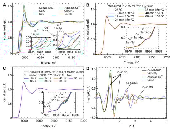 (A–C) Normalized Cu-XANES spectra (A) and k-weighted Cu-EXAFS Img[(R)] spectra (C) of ALD-synthesized Cu-NU-1000 and reference materials. In panel (C), arrows indicate the spectral regions most affected by Cu-O single scattering (SS) and multiple scattering (MS), as well as by Cu-Cu SS. (B–D) Normalized Cu-XANES spectra of Cu-NU-1000 during activation in oxygen (B) and methane loading (D) at 150 °C. In panels (A,B,D) the insets evidence the pre-edge feature at 8977–8978 eV due to the 1s→3d electronic transition for the distorted symmetry of Cu(II) as well as the 1s→4p transitions for Cu(I) and Cu(II) at 8982–8984 and 8985.5 eV, respectively (adapted with permission from Ref. [71]. Copyright 2017, American Chemical Society).