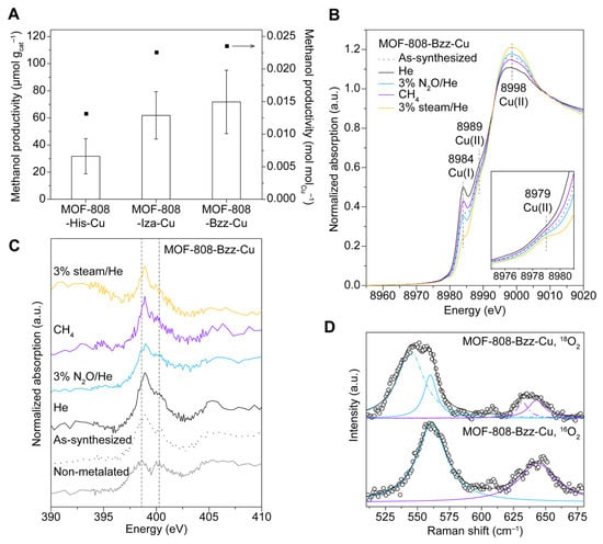 (A) Average CHOH productivity of MOF-808-His-Cu, MOF-808-Iza-Cu and MOF-808-Bzz-Cu. (B) Ex situ Cu K-edge XANES spectra of MOF-808-Bzz-Cu collected after performing the reactions with He, 3% NO/He, CH, and 3% steam/He. (C) Ex situ N K-edge XANES spectra of MOF-808-Bzz, as-synthesized MOF-808-Bzz-Cu, and MOF-808-Bzz-Cu after performing the reactions with He, 3% NO/He, CH, and 3% steam/He. (D) Resonance Raman spectra of MOF-808-Bzz-Cu synthesized using O and O (the wavelength of the laser was 407 nm) (reprinted with permission from Ref. [69]. Copyright 2018, American Chemical Society).