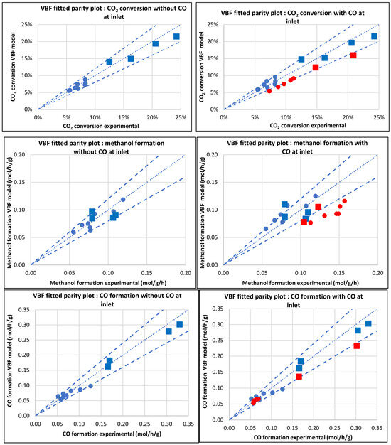 Parity plots for CO2 conversion and MeOH and CO formation considering the VBF model, with and without CO in the feed. The parity lines are 20%. The middle line represents the 0% error line. Points ●: T = 210 °C; ■: T > 210 °C; blue represents points without CO inlet, while red represents points with CO inlet.
