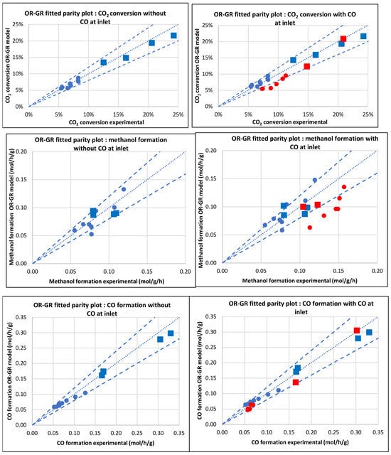 Parity plots for CO2 conversion and MeOH and CO formation, considering the OR-GR model with and without CO in the feed. The parity lines are 20%. The middle line represents the 0% error line. Points ●: T = 210 °C; ■: T > 210 °C; blue represents points without CO inlet while red represents points with CO inlet.