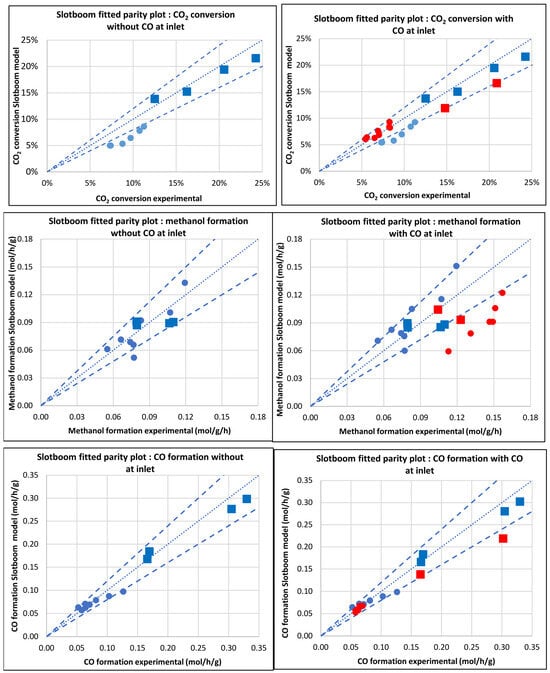 Parity plots for CO2 conversion and MeOH and CO formation, considering the Slotboom model with and without CO in the feed. The parity lines are 20%. Points ●: T = 210 °C; ■: T > 210 °C; blue represents points without CO inlet while red represents points with CO inlet.