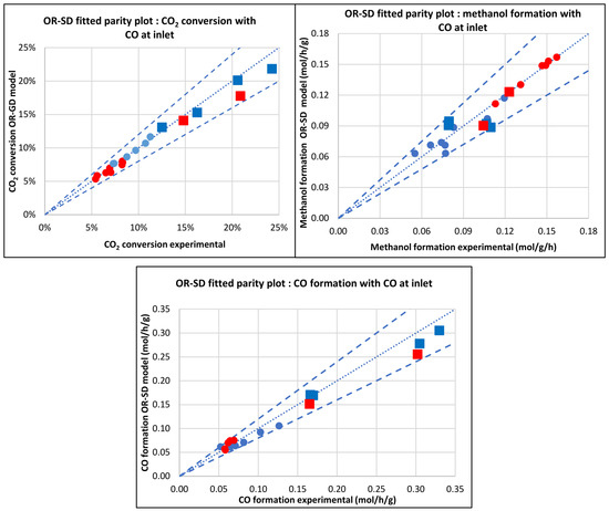 Parity plots for CO2 conversion, MeOH, and CO formation considering the original OR-SD model with and without CO in the feed. The parity lines are 20%. Points ●: T = 210 °C; ■: T > 210 °C; blue represents points without CO inlet while red represents points with CO inlet.