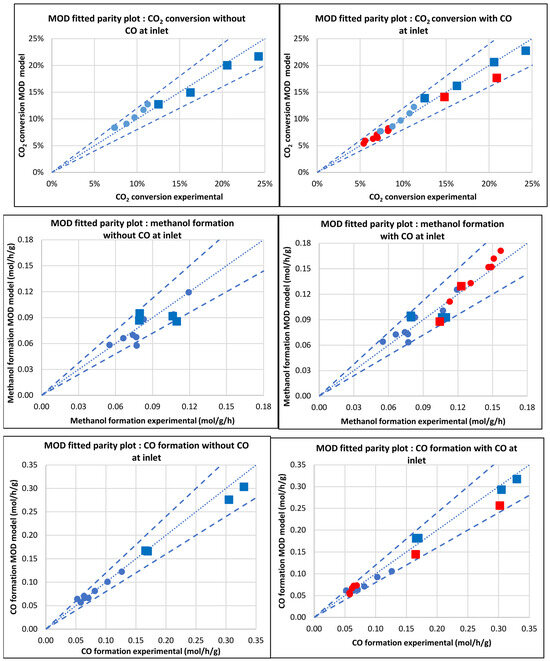 Parity plots for CO2 conversion, MeOH, and CO formation considering MOD model with and without CO in the feed. The parity lines are 20%. Points ●: T = 210 °C; ■: T > 210 °C; blue represents points without CO inlet while red represents points with CO inlet.