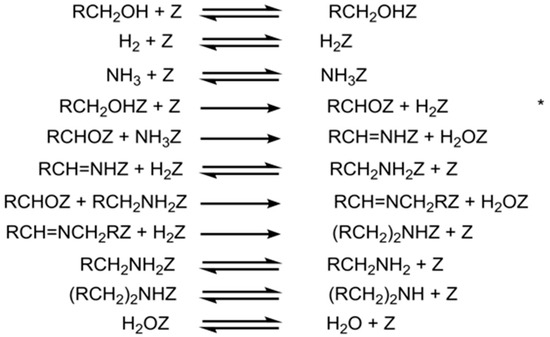 The mechanism of the alcohol reductive amination reaction, also known as the dehydroamination reaction [56], was first proposed by Schwoegler et al. in 1939 [57]. According to this “dehydrogenation-imidization-hydroamination” mechanism, an alcohol is first dehydrogenated over a hydrogenation/dehydrogenation catalyst to generate an aldehyde or ketone and then undergoes a nucleophilic attack by NH3 and dehydration leading to the formation of an imine or Schiff base. Finally, the imine/Schiff base is reduced to a primary amine via catalytic hydrogenation. This viewpoint was supported by Bashkirov et al. [28], who studied the reductive amination of ethanol and identified the α-hydrogen extraction in the dehydrogenation step as the rate-determining step. Figure 1 shows the reaction scheme, where Z is the active center on the catalyst, and * is the rate-determining step. Although the researchers agreed that the intermediates of the reductive amination of alcohol were aldehydes or ketones, the mechanism was not confirmed until 1983 when Baiker et al. [58], for the first time isolated the intermediate aldehydes from the amination reaction of alcohols.