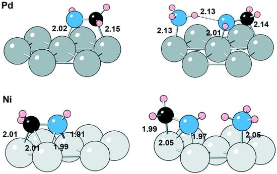 Imine adsorption in the absence and presence of NH3 on Pd and Ni. The distances are given in Å. Reprinted with permission from Ref. [103]. Copyright 2018, Royal Society of Chemistry.