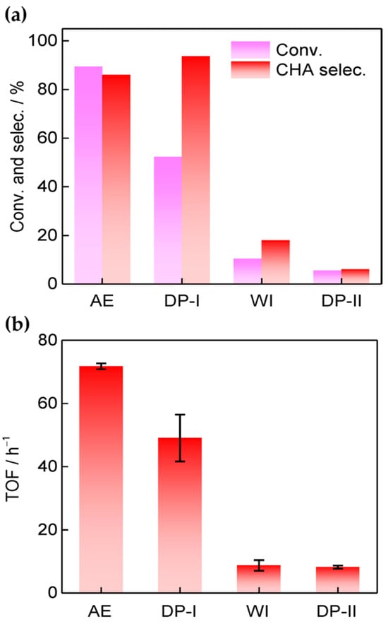 Liu et al. [81] prepared a bifunctional Ni-based catalyst (Ni/SiO2-AE) containing nickel nanoparticles and Lewis acid sites derived from nickel phyllosilicates via a modified ammonia evaporation method and used it in the reductive amination reaction of phenol. As shown in Figure 4, the Ni/SiO2-AE catalyst enabled 89.4% phenol conversion and 86.0% selectivity for cyclohexylamine at 160 °C for 2 h, outperforming the catalysts formed via conventional deposition–precipitation (Ni/SiO2-DP) and wetness-impregnation (Ni/SiO2-WI). Based on the actual exposed metal surface area, the overturning frequencies (TOF) of Ni/SiO2-AE, Ni/SiO2-DP, and Ni/SiO2-WI were calculated as 71.7, 49.0, and 8.7 (h−1), respectively. Catalyst characterization results combining FTIR, XRD, TEM, and NH3-TPD indicated that the nickel phyllosilicate structure was beneficial for the construction of small nickel nanoparticles (3 nm) and abundant Lewis acid sites necessary for phenol amination. The Ni nanoparticles exsoluted from nickel phyllosilicates participated in the activation of dihydrogen molecules, and the Lewis acid sites generated by the coordinated unsaturated Ni2+ sites on the catalyst played a role in adsorbing and activating phenol. The synergistic effect of the dual functions enhanced the activity of the phenol amination reaction.