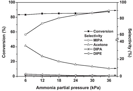 Shin et al. [71] found that Co/Al2O3 had good activity and selectivity for the reaction of isopropanol with NH3 that leads to the production of isopropylamine. With the increase in the Co loading, the conversion of isopropanol and the yield of isopropylamine increased significantly until the Co loading reached 23%. Additionally, with the increase in NH3 partial pressure, the conversion of isopropanol was basically constant, the selectivity for isopropylamine gradually increased, and the selectivity for the dehydration by-product acetone decreased (Figure 5). This is because excess NH3 promotes the reductive amination of acetone, which increases selectivity for isopropylamine.