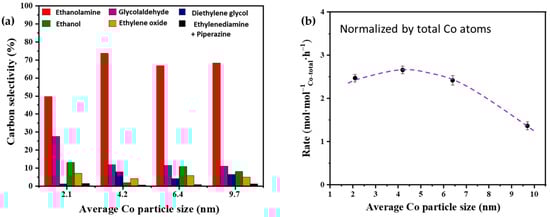 (a) Effects of Co particle size on the carbon selectivity of ammonolysis of ethylene glycol on Co/γ-Al2O3 catalysts. Red represents ethanolamine; purple represents glycolaldehyde; blue represents diethylene glycol; green represents ethanol; orange represents ethylene oxide; black represents ethylenediamine + piperazine. (b) Effects of Co particle size on the rate of ethylene glycol conversion over Co/γ-Al2O3 catalysts normalized by the total Co atoms. The dot represents the rate of ethylene glycol conversion. Reprinted with permission from Ref. [87]. Copyright 2021, MDPI.