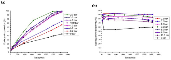 Ruiz et al. [110] studied the catalytic performance of different noble metal catalysts (Ru/C, Pd/C, Ir/C, Pt/C, and Os/C) on the reductive amination of dodecanol with NH3 to produce dodecylamine. Under the reaction conditions of 150 °C, 0.4 MPa of NH3, 0.2 MPa of H2, and 24 h, the yield of dodecylamine was 83.8% over the Ru/C catalyst; the results are shown in Figure 7c. The authors studied the effects of H2 pressure and NH3 pressure on the reaction. In the case of excess NH3 (applied to suppress the formation of secondary amines), changing the pressure of NH3 had no significant effect on the conversion of dodecanol and selectivity for dodecylamine. When H2 was not introduced, the conversion of dodecanol and the selectivity for dodecylamine were relatively low, and the main by-product was dodeconitrile. After the introduction of H2 into the reaction system, the conversion of dodecanol and the selectivity for dodecylamine both increased. However, when the H2 pressure was too high, dodecanol was cracked, producing a large amount of undecane. Moreover, it was found that the deactivation of the Ru/C catalyst occurred due to surface coking. Ruiz et al. [67] also studied the direct amination of dodecanol with NH3 and H2 over the catalysts of Rh, Pt, Ir, Ru, Ni, Cu, and Co supported on SiO2. The results showed that Ru and Ir catalysts had greater activity, while Ni and Co catalysts exhibited better selectivity in alcohol reductive amination.