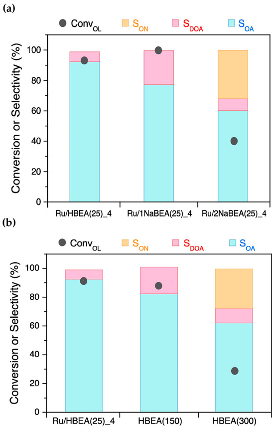 Fang et al. [59] investigated the reaction of 1-octanol with ammonia for the synthesis of 1-octylamine and examined the catalytic activity of loaded Ru catalysts on different acidic carriers including zeolites with various topologies and Si/Al ratios, in which the Ru/HBEA (Si/Al = 25) catalysts with 5 wt% Ru achieved a greater than 90% conversion of 1-octanol and 90% selectivity for 1-octylamine (Figure 8a). The authors attributed this result to the presence of moderately strong Brønsted/Lewis acid centers near the Ru nanoparticles located on the outer surface of HBEA.