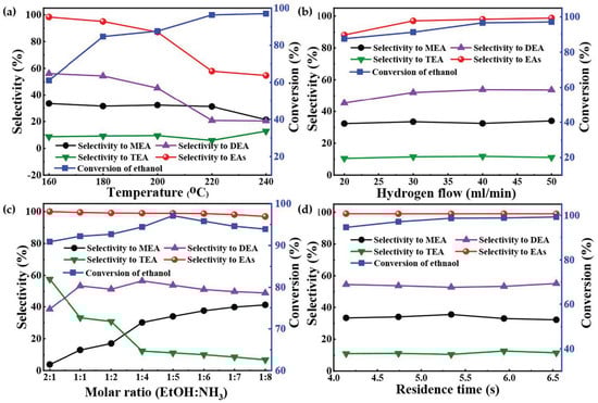 Amination results of ethanol with NH3 over 9% Ni-3% Cu/MgAlO under different reaction conditions. (a) Molar ratio of ethanol to NH3 is 1:5, flow rate of H2 is 20 mL/min, flow rate of NH3 is 38 mL/min, residence time is 5.34 s, and time on stream is 6 h. (b) Temperature is 200 °C, molar ratio of ethanol to NH3 is 1:5, flow rate of NH3 is 38 mL/min, residence time is 5.34 s, and time on stream is 6 h. (c) Temperature is 200 °C, flow rate of H2 is 50 mL/min, flow rate of NH3 is 38 mL/min, residence time is 5.34 s, and time on stream is 6 h. (d) Temperature is 200 °C, molar ratio of ethanol to NH3 is 1:5, flow rate of H2 is 50 mL/min, flow rate of NH3 is 38 mL/min, and time on stream is 6 h. Reprinted with permission from Ref. [38]. Copyright 2023, American Chemical Society.