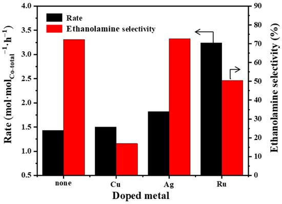 Liu et al. [87] explored the effect of a second metal doping on a Co/γ-Al2O3 catalyst on the amination reaction of ethylene glycol to ethanolamine. As shown in Figure 13, the Co/γ-Al2O3 catalyst could be further improved by adding appropriate amounts of Cu, Ag, and Ru, while only in the case of Ag doping, the catalytic activity was further improved and a high chemical selectivity toward ethanolamine was maintained. Combined with kinetic and infrared spectroscopy evaluations, the results revealed that the dehydrogenation of ethylene glycol to glycolaldehyde was the rate-determining step in the reductive amination of ethylene glycol over cobalt-based catalysts. The introduction of Ag dopants weakened the adsorption of NH3 on the Co surface. More Co sites could be used to catalyze the dehydrogenation of ethylene glycol, indicating that Ag doping can promote the ammonolysis activity of Co/γ-Al2O3 catalysts.