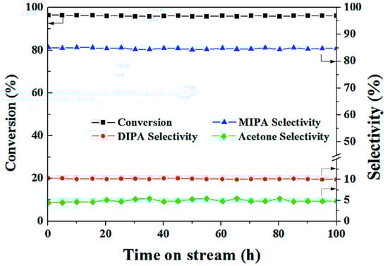 Hong et al. [94] successfully synthesized Ni-xFe/γ-Al2O3 catalysts with different Fe/Ni molar ratios (x = 0–0.7) via a co-impregnation method and investigated their catalytic properties in the reductive amination of isopropanol (IPA). The characterization results of the catalysts, obtained by combining N2-adsorption, X-ray diffraction, H2 temperature-programmed reduction, and X-ray photoelectron spectroscopy, showed that there was a synergistic effect of the bimetallic Ni-Fe on the γ-Al2O3 support. With the addition of Fe species, the surface Ni0 content and the reducibility of the Ni component also increased. The maximum Ni0 content was reached when the Fe/Ni molar ratio was 0.3. At the same time, the conversion rate and selectivity of the reductive amination of isopropanol to monoisopropylamine (MIPA) reached the highest levels. As shown in Figure 14, under optimized experimental conditions, the Ni-0.3Fe/Al2O3 catalyst achieved the highest IPA conversion (95.6%) and MIPA selectivity (83.0%), and it maintained relatively constant conversion and selectivity over 100 h on stream in a hydrogen atmosphere.