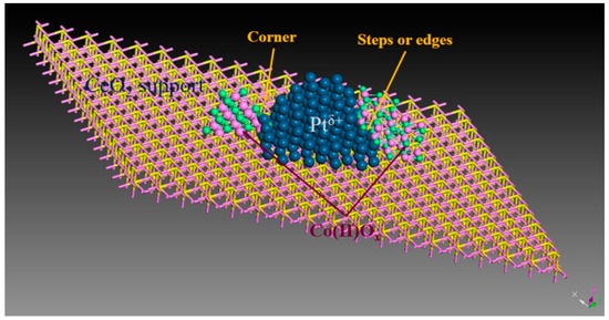 Geometric structure of 1%Pt-1%Co/CeO2 catalyst. Pink: O, blue: Pt, green: Co, and yellow: Ce. Reprinted with permission from Ref. [117]. Copyright 2019, Elsevier Inc.