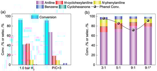 - Liu, X.; Chen, W.; Zou, J.; Ye, L.; Yuan, Y. Liquid-phase amination of phenol to aniline over the Pd/MgO catalyst without external hydrogen addition. ACS Sustain. Chem. Eng. 2022, 10, 6988–6998. [Google Scholar] [CrossRef]