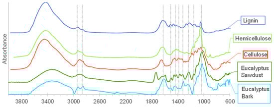 By observing the FTIR spectra of the biomass samples and comparing them with the standard spectra of cellulose, hemicellulose, and lignin presented by Galletti et al. [21], it is possible to attribute the different peaks to each compound. Thus, the spectra of all samples display a prominent band within the range of 3500–3200 cm−1, which can be attributed to the stretching vibration of hydroxyl groups. This intense signal in all biomasses indicates the presence of abundant hydroxyl functional groups due to, for example, moisture. E. globulus bark has peaks in the range of 2930 and 2850 cm−1 of aliphatic C-H stretching [14], which is characteristic of lignin and hemicellulose, whereas at these wavenumbers, sawdust has a single peak observed for cellulose. Another prominent peak in the spectrum of E. globulus bark and of the three biopolymers occurs at 1730–1620 cm−1 and is due to the C-O stretching of hemicellulose and lignin and the C-C stretching of the lignin aromatic rings [14]. Peaks at 1510 cm−1 and 1320 cm−1 are found in the spectra of both biomasses and stand out, respectively, in the lignin and cellulose spectra. Finally, it is worth mentioning that the peak at 1025 cm−1 is seen in all spectra but has greater intensity in the spectrum of hemicellulose.