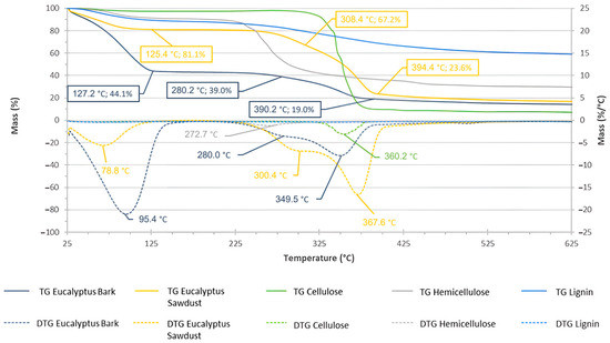 The TGA and DTG curves of the biomass samples and the standards are presented in Figure 2. The TGA of E. globulus bark shows the first weight loss of 55.9% between 25 °C and 140 °C or, more precisely from the DTG curve, at 95.4 °C. This mass loss is due to moisture evaporation. The second plateau, with a mass loss of 5.1%, occurs between 140 and 300 °C; the comparison with the standards allows us to conclude that this mass loss corresponds to the degradation of hemicellulose. The third plateau, corresponding to a mass loss of 20.0%, appears between 300 and 420 °C, and is the loss peak at 349.5 °C, which corresponds to cellulose degradation. Finally, the fourth plateau, with a mass loss of 5.6%, is due to lignin degradation that occurs throughout the test. The solid residue determined by difference corresponds to 13.4%. It is worth noting that the results for E. globulus dust (not presented) were similar with some deviations in the pick temperatures.