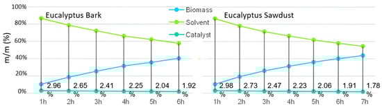 The conditions used in the laboratory tests with E. globulus bark and sawdust are presented in Table 8. To start each experiment, the solvent quantity was added to the reactor, the thermostat was set to 80 °C, and the stirrer was switched on and set at a speed of around 180 rpm. When the temperature reached 80 °C, the pre-treated biomass was added to the reactor and the thermostat was set at 160 °C. During the temperature rise, at around 99 °C, a mixture of water and solvent, which form an azeotrope (40% water and 60% solvent, w:w), was collected in a dean stark. After its complete removal, the temperature continues rising until the defined set point. When the reactor mixture reached 160 °C, the desired quantity of the catalyst was added to the reactor, and the reaction timer was set to begin. After the reaction, acetone was mixed with the reactor content, and the mixture was filtered to separate the solids. The filtrate was distilled to remove the acetone and recover the bio-oil. The solid residues were washed with acetone and dried at 80 °C in an oven and then cooled down to room temperature in a desiccator and weighed. The weight of the residue was used to calculate the conversion of the biomass into bio-oil using the following equation: