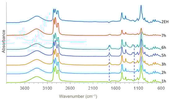 FTIR spectra of samples of the liquefied product taken before each addition of E. globulus bark to the reactor were also collected. As shown in Figure 4, all liquefied products exhibited the characteristic peaks of the 2EH spectrum. On the other hand, the peaks at 1750 cm−1 and 1235 cm−1 increased in intensity with the number of biomass increments. These peaks correspond to C=O bonds, which are characteristic of ketone or aldehyde functional groups, and COOH bonds, which are characteristic of carboxylic groups [12]. The increase in these peaks’ intensity with the reaction time can be attributed to cellulose depolymerization into levulinic acid and furfural or an increase in hemicellulose content due to the addition of biomass [24,25]. The elongated peak in the range of 3300 cm−1, representing OH groups, is typically associated with moisture [26].