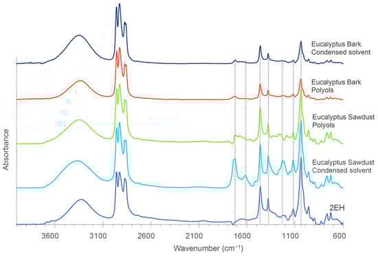 Figure 5 displays the FTIR spectra of polyols and pure and condensed solvents. As seen, the polyols exhibit peaks corresponding to 2EH, particularly in the 3000–2800 cm−1 range. The peaks at 1790 cm−1 and 1685 cm−1 in the polyols spectrum are characteristic of C=O bonds [22]. These peaks indicate the presence of soluble fragments produced during depolymerization reactions, such as levulinic acid, lactic acid, and/or furfural [24,25]. However, these peaks can also be attributed to the presence of partially depolymerized hemicellulose and lignin [26]. The band at 1610 cm−1, due to CH2 bonds, can also indicate the presence of cellulose and hemicellulose polymers [12]. Finally, the peaks at 1575, 1465, 1213, 1138, 877, and 839 cm−1 are observed in the spectra of pure and condensed solvents.