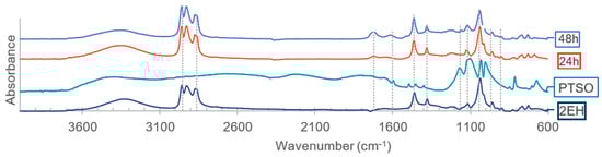 The spectrum of the bio-oils produced in one of the reactions carried out with the mixture of 2EH and DEG as solvents is presented in Figure 7 (reaction 3 in the Supporting Information) and shows that the bio-oils and polyols contain 2EH and DEG. In fact, the peaks at 2958, 2926, and 2872 cm−1 due to C-H bonds are visible in both phases. On the other hand, the peak at 1350 cm−1, representing C-OH vibrations, as well as at 1215 and 1118 cm−1, is associated with the C-O bonds of esters, and the peaks at 912 and 886 cm−1, corresponding to C-O-C bonds, indicate the presence of DEG. The peak at 1038 cm−1, indicative of C-OH groups of both solvents, appears in the spectra of all samples.