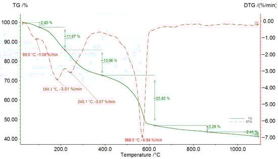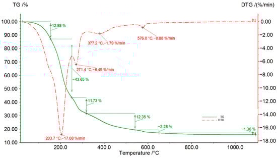The TG curve of the 8 h product from the third reaction shown in Figure 9 exhibits a distinct pattern. In fact, five distinct plateaus in the TG and DTG curves can be distinguished. The first plateau spans from 25 to 152 °C, with a mass loss of 12.9%, and the second plateau, ranging from 152 to 253 °C, includes the most pronounced peak of mass loss at 204 °C, resulting in a loss of 43.7% of the sample mass. This temperature range corresponds to the degradation of DEG. The third plateau (253–295 °C) peaks at 271.4 °C, indicating a further 9.7% mass loss. The last two plateaus occur between 295 and 466 °C and 466 and 603 °C, with 12.4% and 2.3% mass losses, respectively.